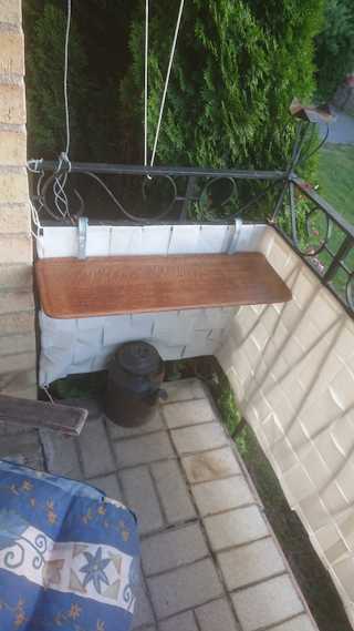 Balkongskydd på plats samt litet bord av restvirke och delar av platt TV till