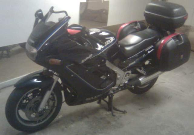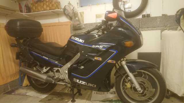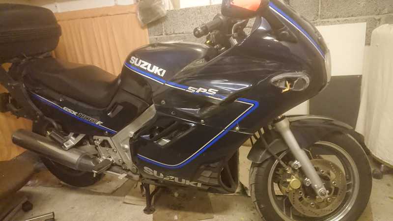 Reparation: 1. Kunde ta bottenplatta till blinkers frĂ„n en bakre blinkers som blivit över nĂ€r âGivi-pack vĂ€ske systemet med blinkers monterades nĂ„gon gĂ„ng pĂ„ 90talet, 2. Fick bygga upp nya fĂ€sten runt skruvhĂ„l pĂ„ kĂ„pa med glasfiberpadding och koppar-plĂ„t. Repor och plĂ„tar mĂ„las över i vinter med original fĂ€rg lack. 3. BokstĂ€ver U Z kopierade frĂ„n V-sida i silver reflex tape, 4. Har inte lyckats med backspegel lös/sladdrig.