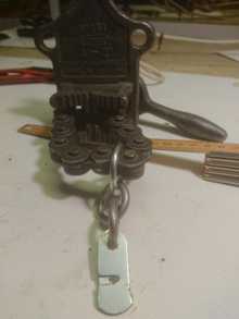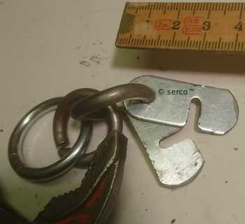 Verktyg för att lossa och sÀtta tillbaka fjÀdrar pÄ stödet. (Vad lÀtt det helt plötsligt blev med min lilla uppfinning. ) Egen lösning: Kapa till tvÄ plÄtbitar (gamla pc kretskorts tÀckplÄtar) kapa , borra hÄl samt sÄga ett jack . Första försöket med nyckelring gick nÀsten nyckelringen drogs ut, kanske hade fungerat med 2 nyckelringar, hittade material till egna ringar, satta i hop 3st för att ha lite olika avstÄnd för ena kÀften pÄ polygrip, (första öglan fungerade bra,)